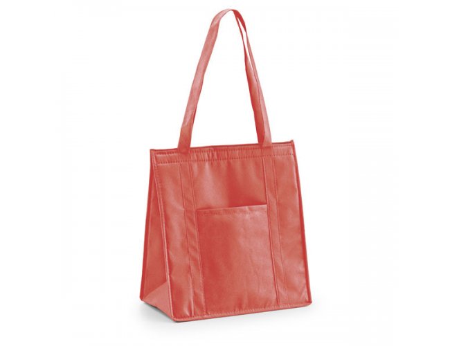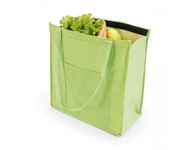 Sacola térmica. Non-woven: 80 g/m². Com fechamento em velcro e bolso frontal. Capacidade até 10 litros.