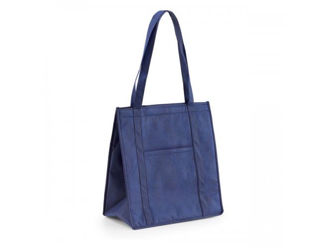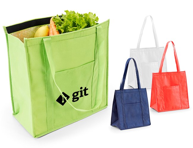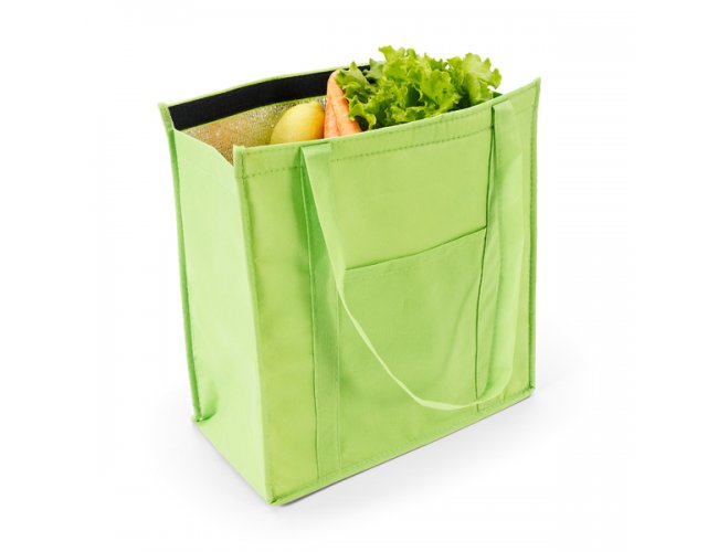 Sacola térmica. Non-woven: 80 g/m². Com fechamento em velcro e bolso frontal. Capacidade até 10 litros.