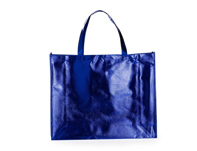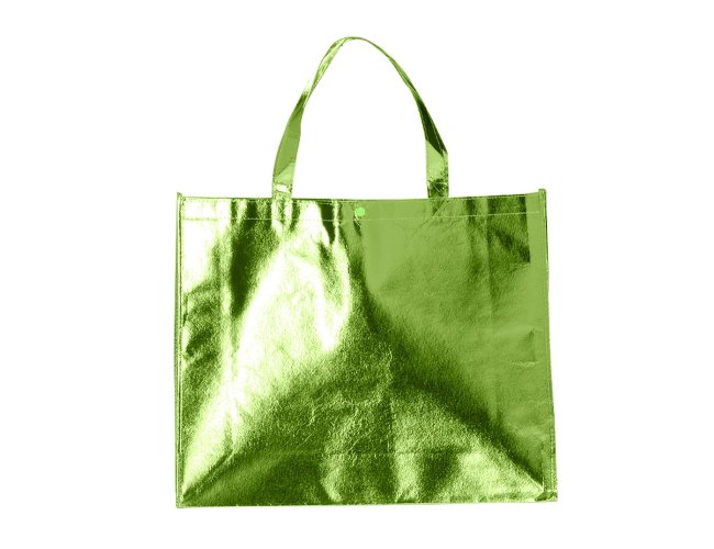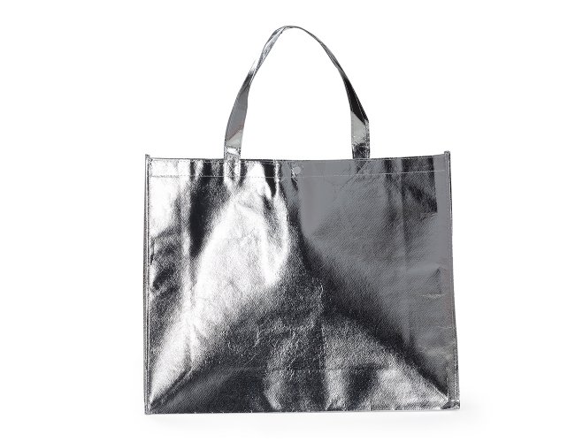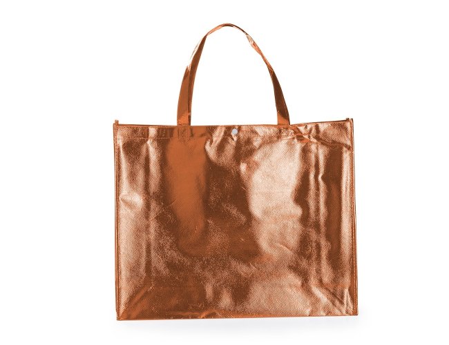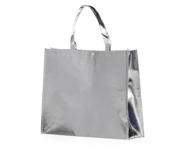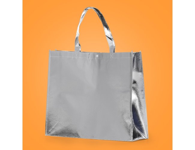 Sacola TNT metalizada 120g/m² com botão. Confeccionado em TNT com revestimento laminado, parte superior possui botão plástico para fecho.
