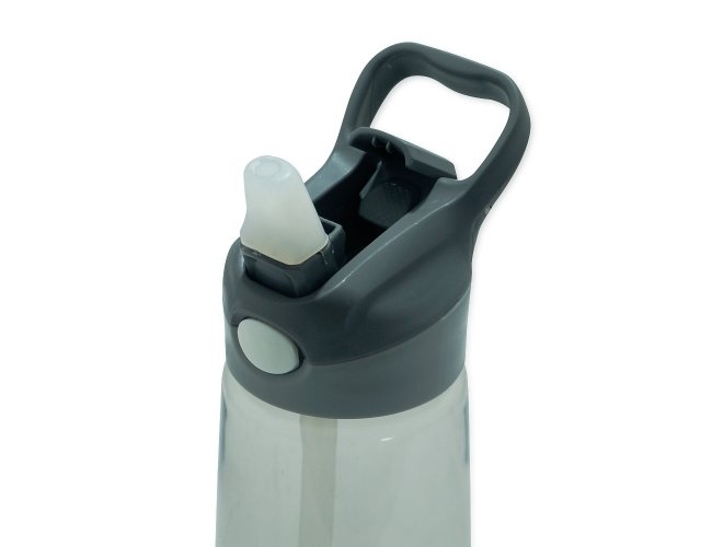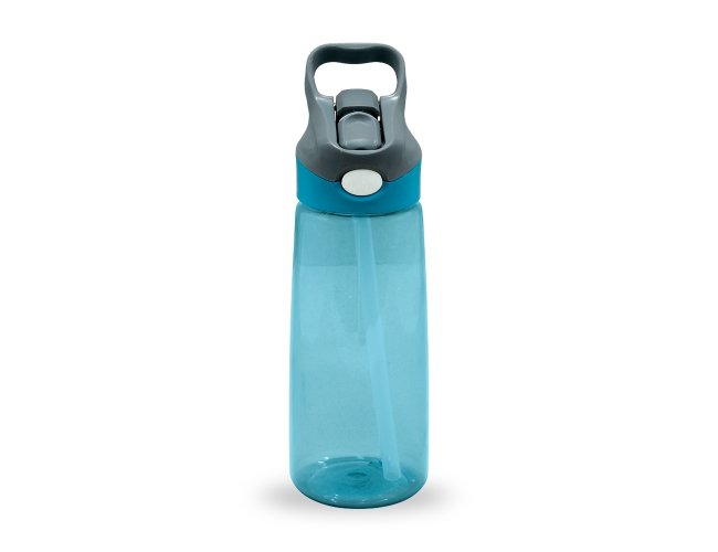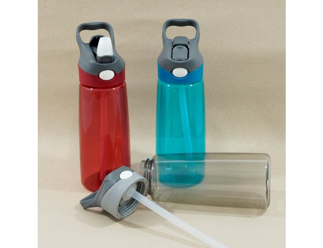 Squeeze 650ml plástico com acionador para abertura. Material plástico transparente, possui tampa rosqueável com alça e botão acionador com proteção plástica para o bico.
