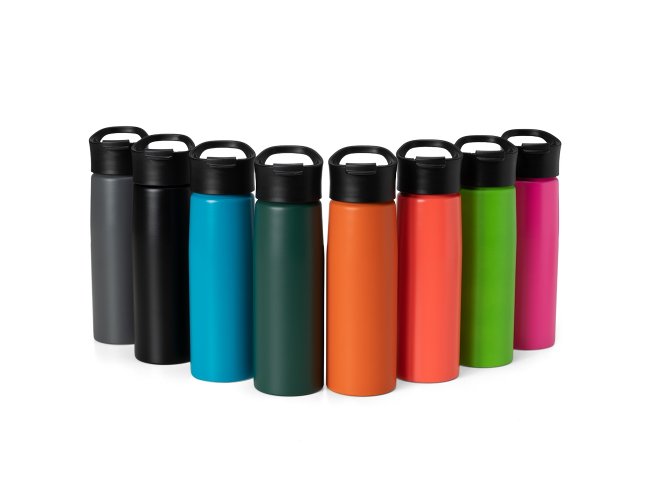 Descrição: Squeeze alumínio de 750ml com pintura fosca. Squeeze com tampa plástica rosqueável, alça e tampa protetora para o bocal.