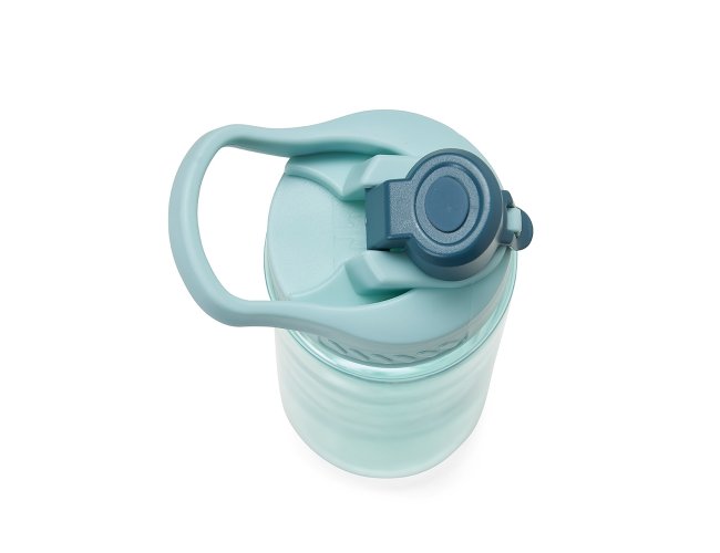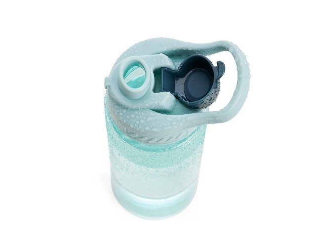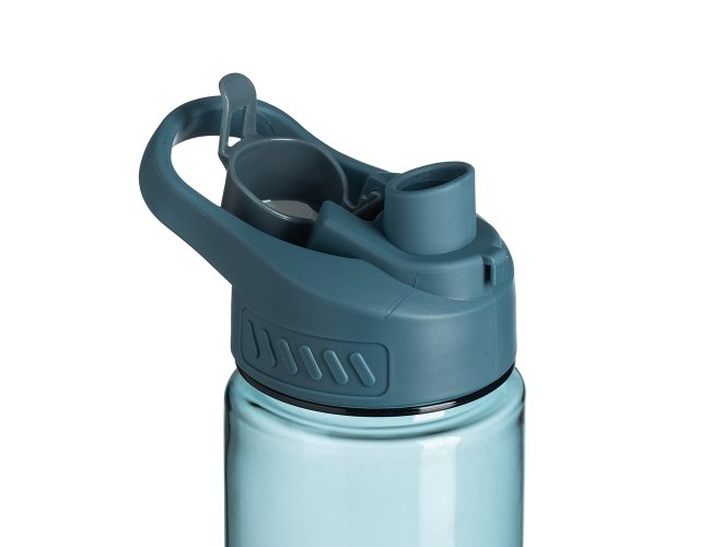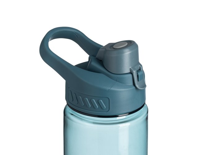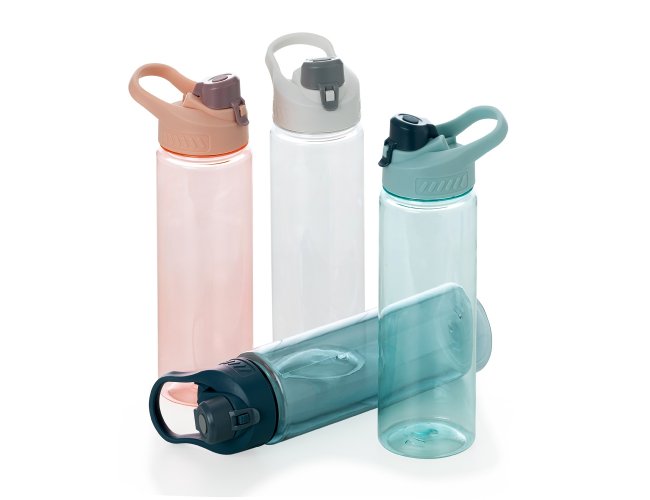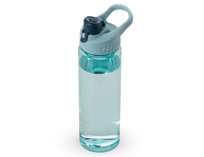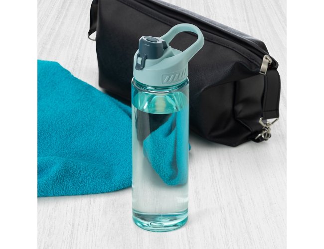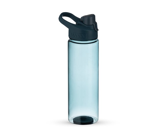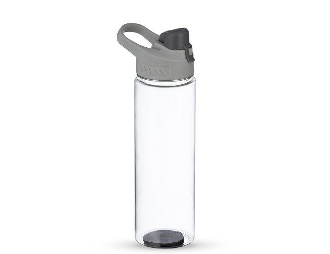 Squeeze plástico 700ml com alça para transporte, possui tampa principal rosqueável e tampa de proteção plástica com trava para o bocal.