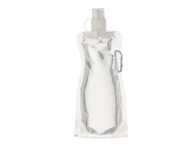 Squeeze dobrável de plástico com 480ml. Squeeze colorido acinturado com mosquetão superior de acordo com a cor do squeeze, possui tampa de bico texturizada e protetor plástico para o bico(com alça).
