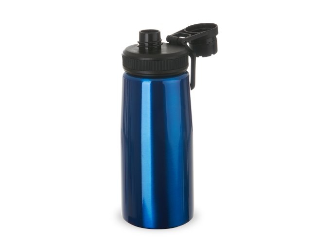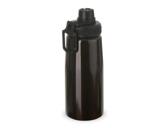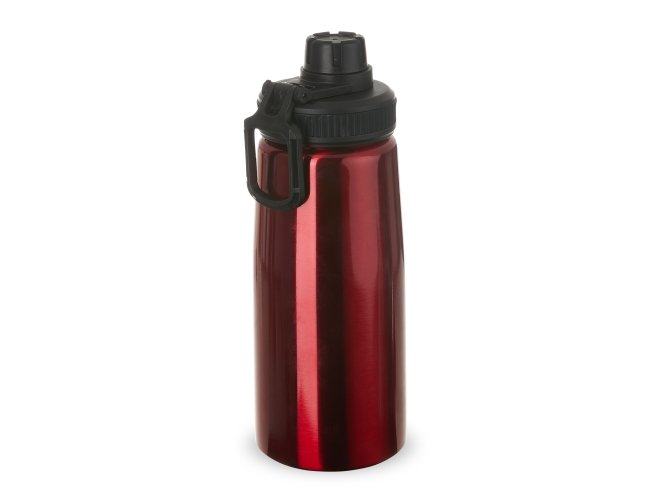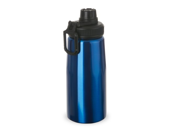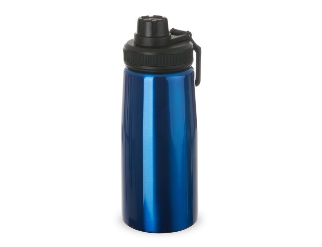 Squeeze metálico 750ml com alça para transporte, possui tampa com detalhe emborrachado e tampa protetora para o bocal.