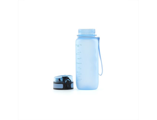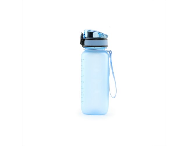 Squeeze plástico com capacidade de 550m. Possui tampa rosqueável protetora com trava de segurança e botão de acionamento. Squeeze com acabamento fosco, detalhes ondulado e alça de nylon para transporte.