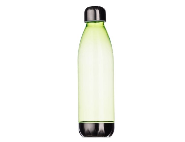 Squeeze plástico 700ml formato garrafa. Corpo transparente colorido, possui tampa e base em alumínio.