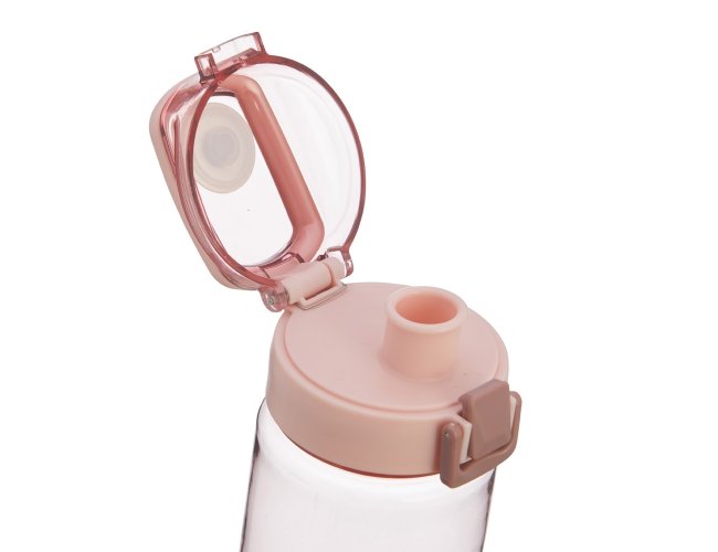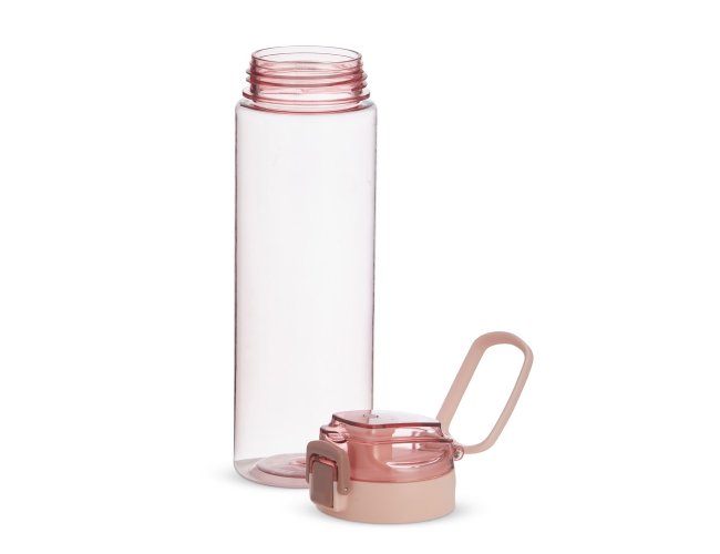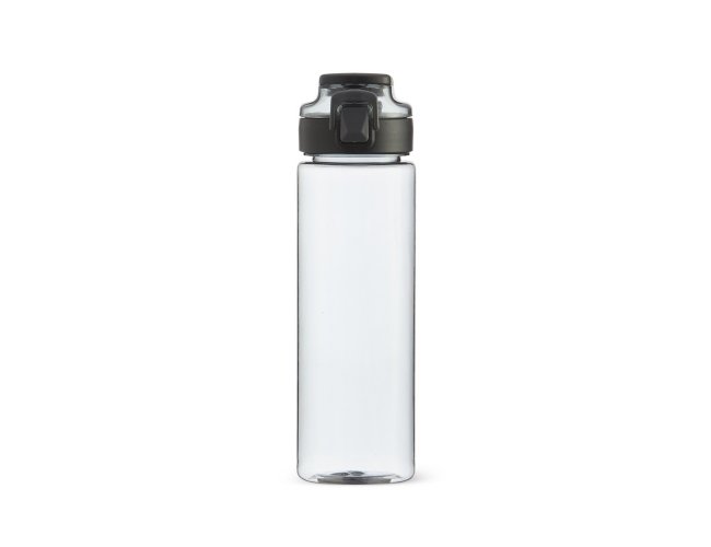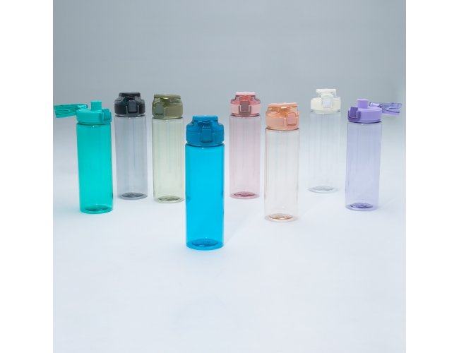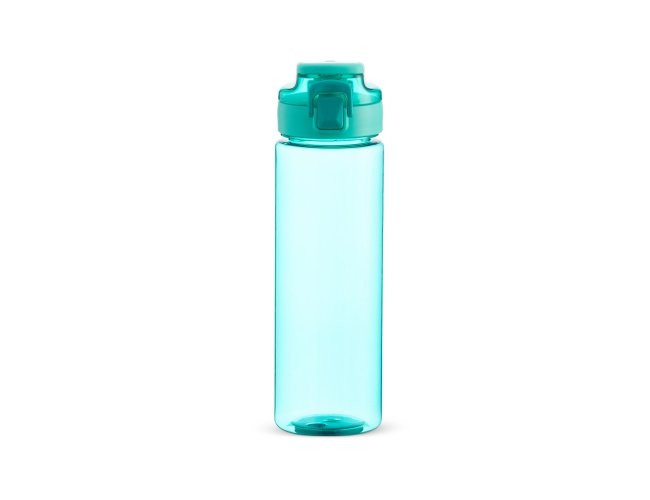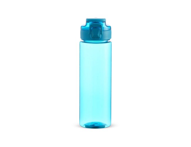 Squeeze plástico com capacidade de 700ml, possui tampa rosqueável com botão de acionamento, trava de segurança e alça para transporte.