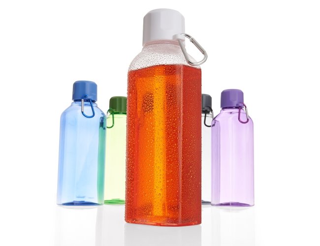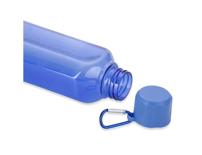 Squeeze plástico 730ml com tampa rosqueável e mosquetão colorido.