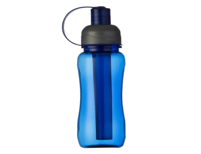 Squeeze plástico 400ml Ice Bar Personalizada com a sua logomarca. Squeeze colorido acinturado com detalhe retangular texturizado nas laterais, possui tampa cinza com detalhe ondulado ao redor e tampa com alça para o bico. Parte interna possui uma barra congelante(desencaixe a barra da tampa), encha a barra e coloque no congelador/freezer para gelar e depois e só colocar novamente no squeeze.
