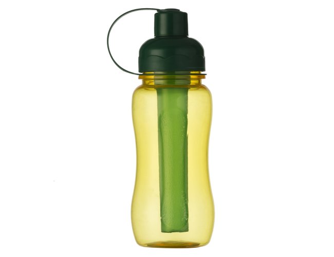 Squeeze plástico 400ml ice bar. Squeeze colorido acinturado com detalhe retangular texturizado nas laterais, possui tampa cinza com detalhe ondulado ao redor e tampa com alça para o bico. Parte interna possui uma barra congelante(desencaixe a barra da tampa), encha a barra e coloque no congelador/freezer para gelar e depois e só colocar novamente no squeeze.