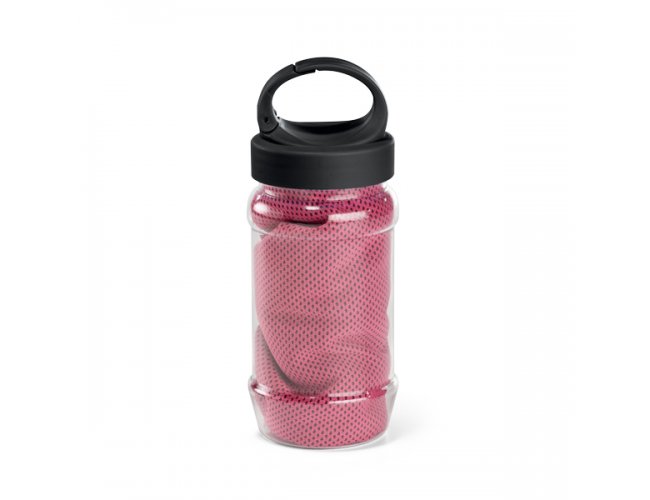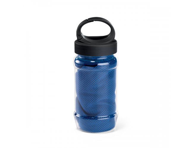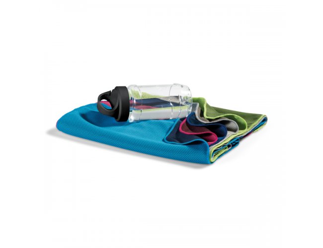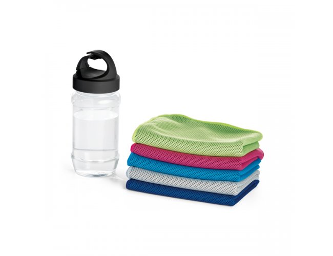 Toalha para esporte. Toalha: poliamida e poliéster. Garrafa: PP e PET. Toalha refrescante, quando molhada permanece fria durante horas. Se aquecer, basta balançar reativando sua frescura. Reutilizável e lavável à máquina. Garrafa com mosquetão inclusa (food grade). Capacidade até 440 ml. Toalha: 300 x 800 mm | Garrafa: ø65 x 125 mm
