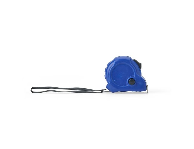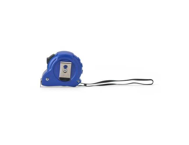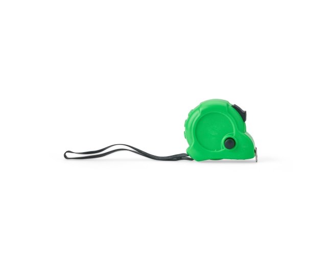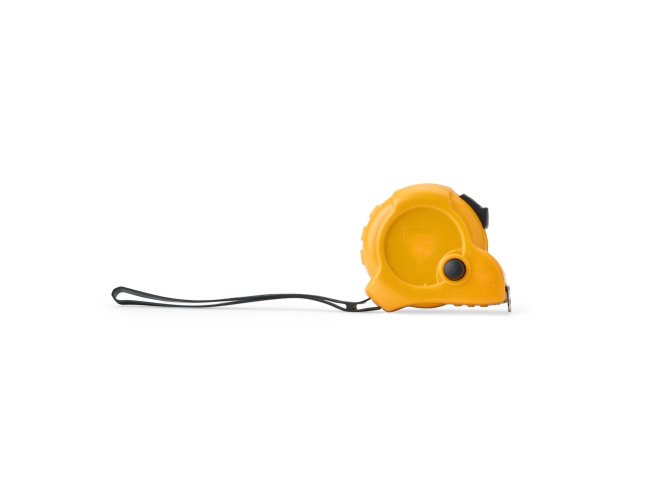 Trena com corpo e presilha em plástico e alça de borracha para transporte. Possui fita de aço com alcance máximo de 3 metros, que também apresenta marcação de medidas em pés e polegadas. Conta com trava de segurança e botão manual que mantém a fita em posição fixa.