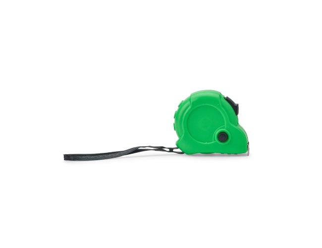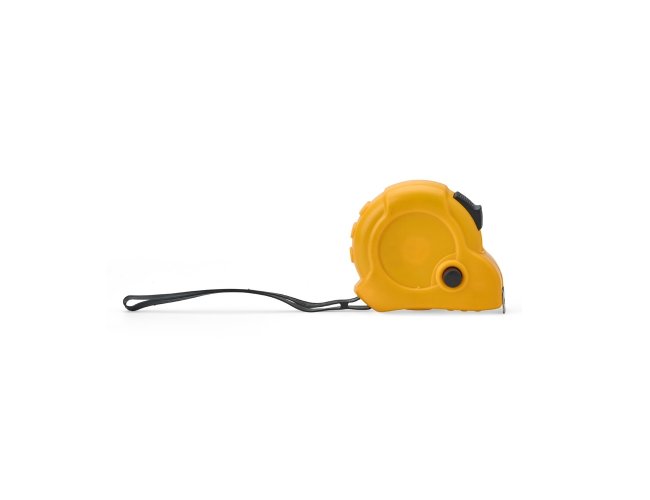 Trena com corpo e presilha em plástico e alça de borracha. Possui fita de aço com alcance máximo de 5 metros, também com marcação de medidas em pés e polegadas. Conta com trava de segurança e botão manual que mantém a fita em posição fixa.