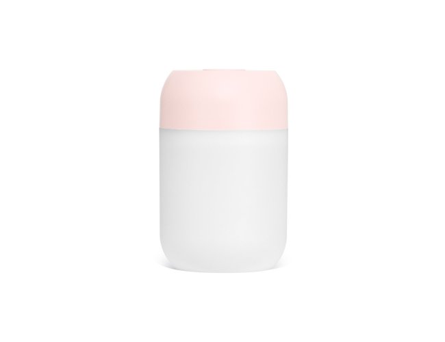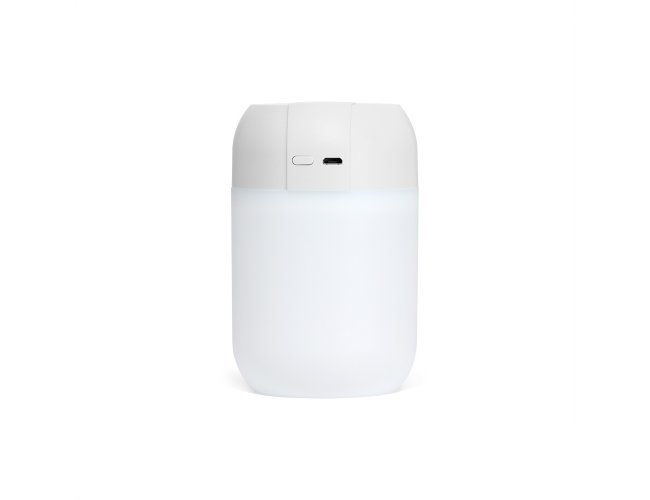 Umidificador de ar feito em plástico com reservatório de água com capacidade para até 300ml e iluminação em LED. Possui dois modos de névoa: contínuo e intermitente. Acompanha cabo Micro USB e filtro de algodão.